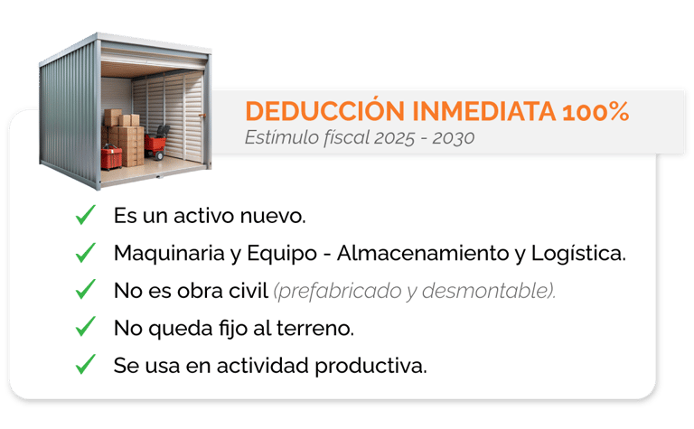 * La deducción inmediata aplica únicamente a bienes nuevos S-Containr que cumplan con los requisitos del Estímulo Fiscal 2025–2030 y la Ley del ISR. Sujeto a clasificación correcta del activo, uso productivo y situación fiscal del contribuyente. Consulta a tu contador.